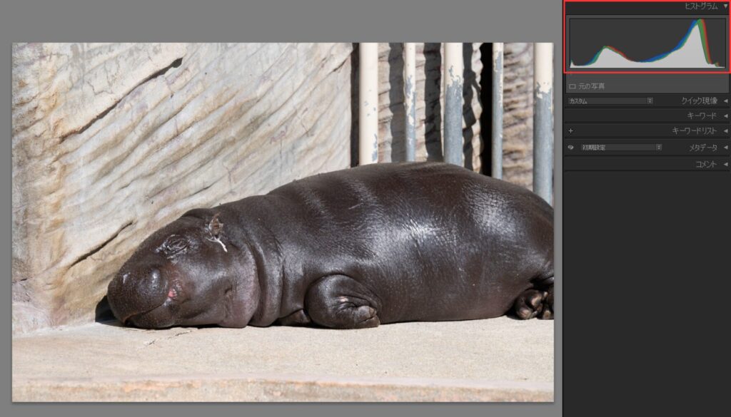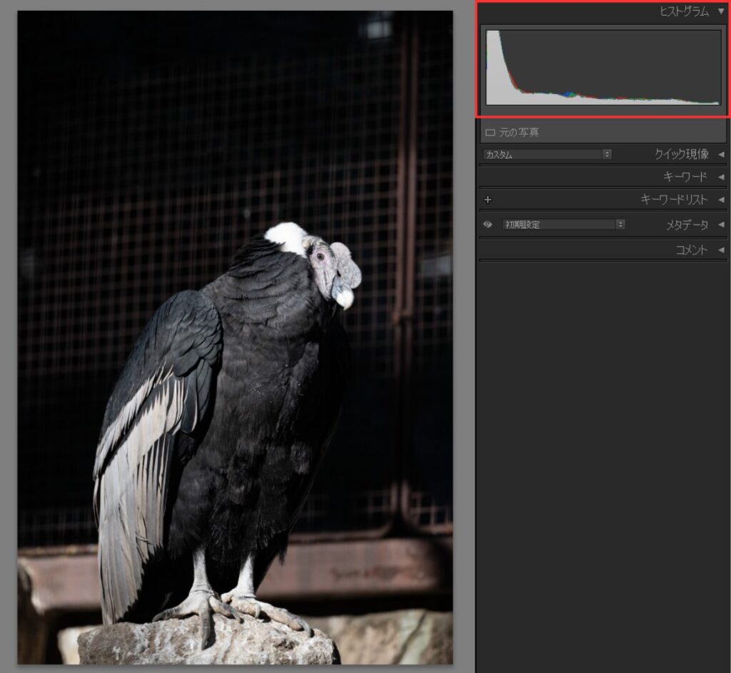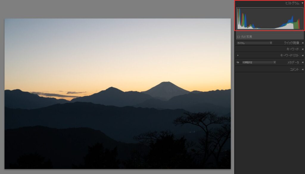 以下の写真は全体的に暗い写真なので、右上のヒストグラムの山が左寄りに集まっています。つまり黒っぽい部分が多いということです。