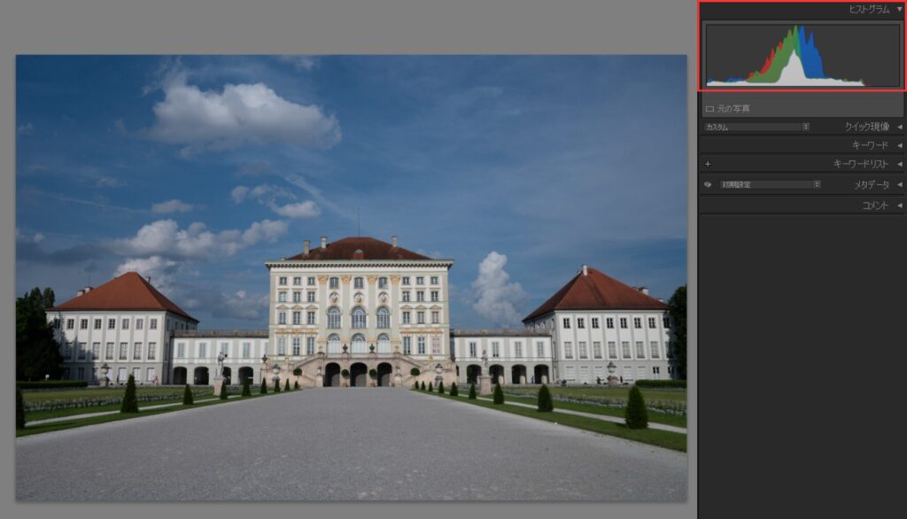 以下の写真は全体的に明るい写真なので、右上のヒストグラムの山が右寄りに集まっています。つまり白っぽい部分が多いということです。