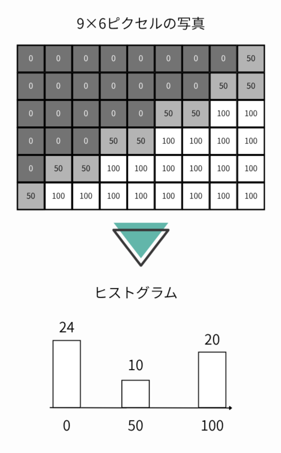 写真を小さな点(ピクセル)に分けたときに、「明るさ10のピクセルは100個」、「明るさ50のピクセルは20個」というように各明るさのピクセルの数をグラフにしたものがヒストグラムです。